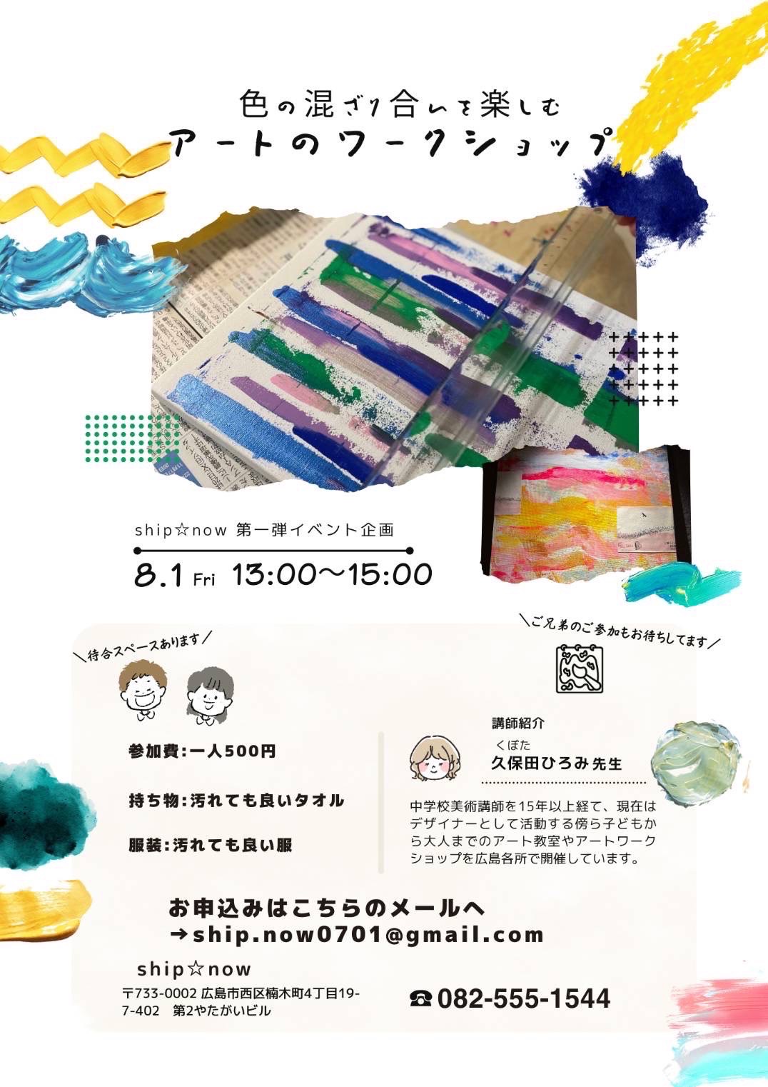 2025.07.22 第一弾イベント アートのワークショップ! Post Share Line ship⭐︎nowの第一弾イベント企画です!2025年8月1日(金) 13:00〜15:00 待合スペースもございますのでご家族の皆様もお気軽にご参加ください♫ お申し込みはこちら 記事のタイトルとURLをコピーする ship⭐︎now OPEN!! 前の記事